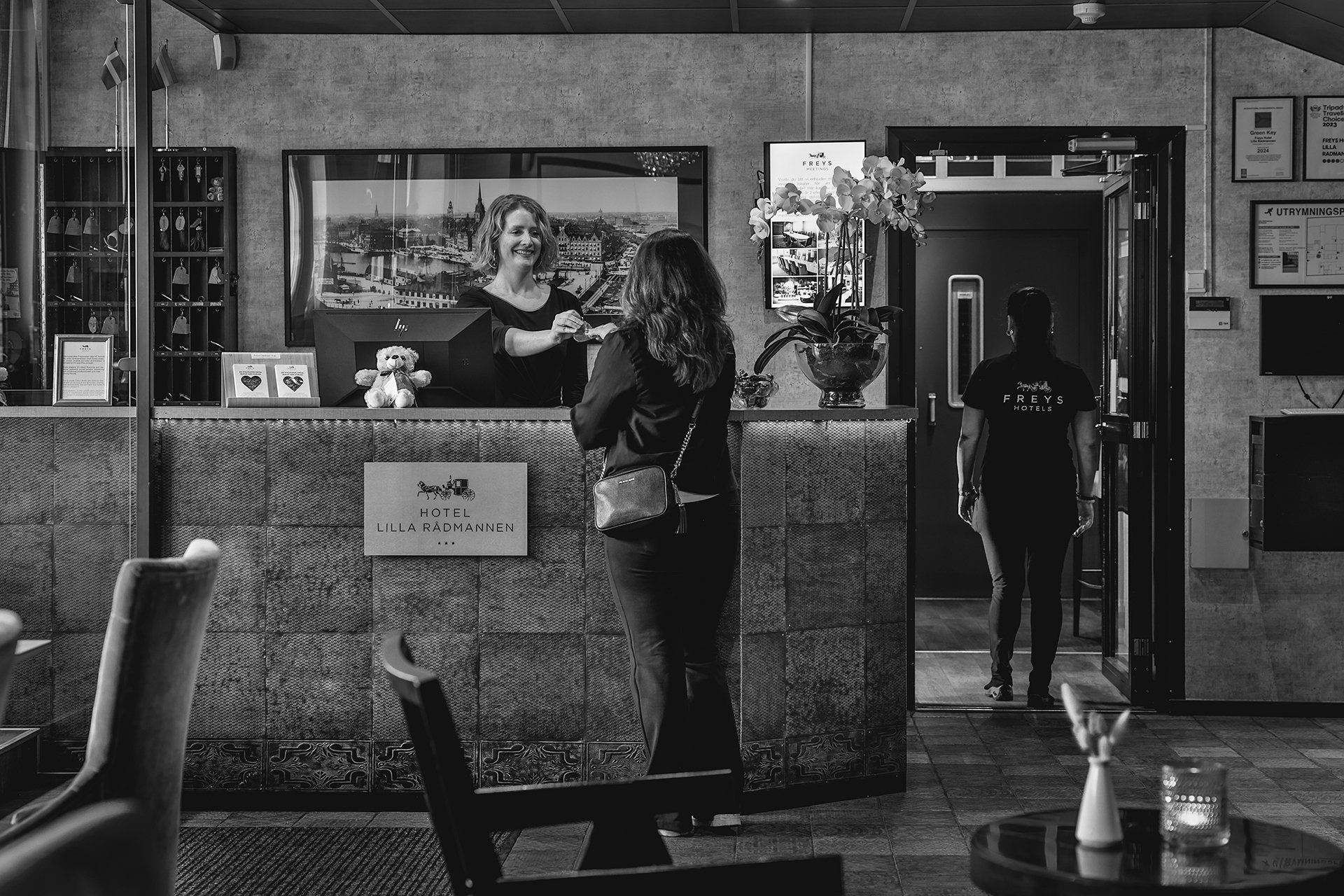 Hotellrummen är uppdelade på två entréer, den ena i anslutning till receptionen och den andra i separat ingång från Rådmansgatan.