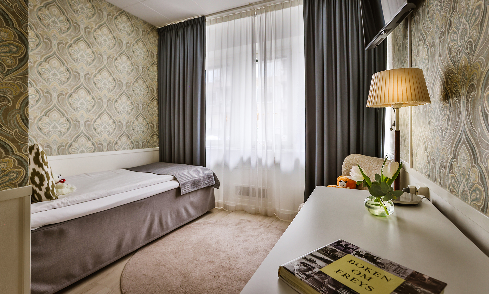 Våra enkelrum erbjuder allt för en bekväm vistelse när du reser på egen hand. I alla enkelrum finns en mindre garderob, ett skrivbord och en skön 90 eller 105 cm bred säng. Rummen vetter mot en innergård eller den lugna gatan, Rådmansgatan.